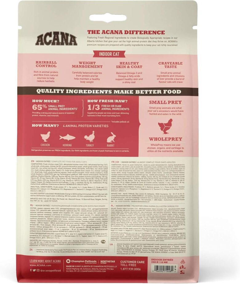 アカナキャットフードは、カナダ産の新鮮な肉や魚を65〜75%使用しており、高タンパクで、低炭水化物の穀物不使用(グレインフリー)のキャットフードです。