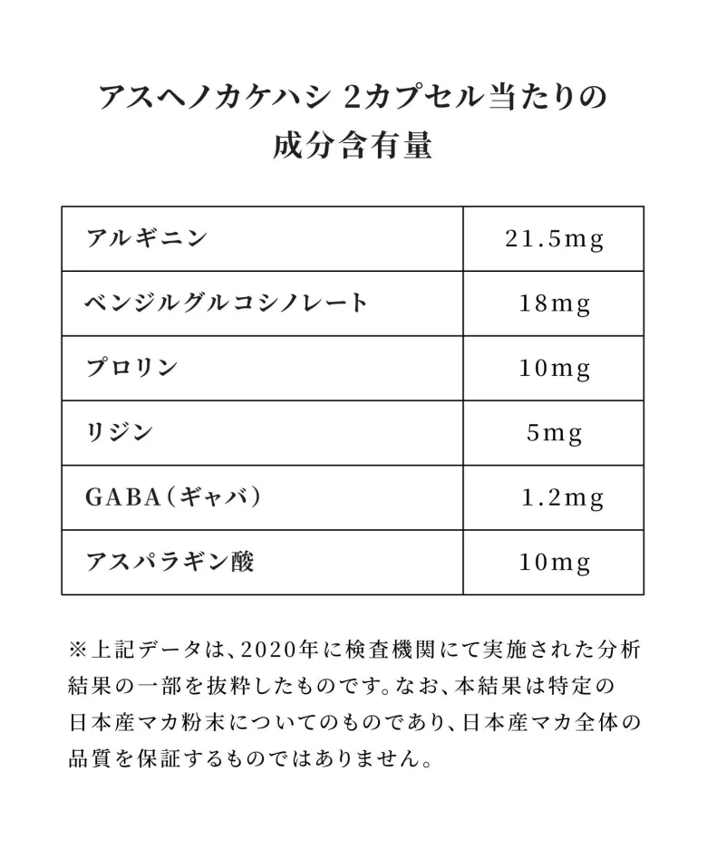 今回ご紹介するのは、研究開発に20年以上もの時間を費やし、ペルー産よりもアルギニンを多く含む無農薬マカ「スーパーマカ」を使用したサプリメント「アスヘノカケハシ」です。