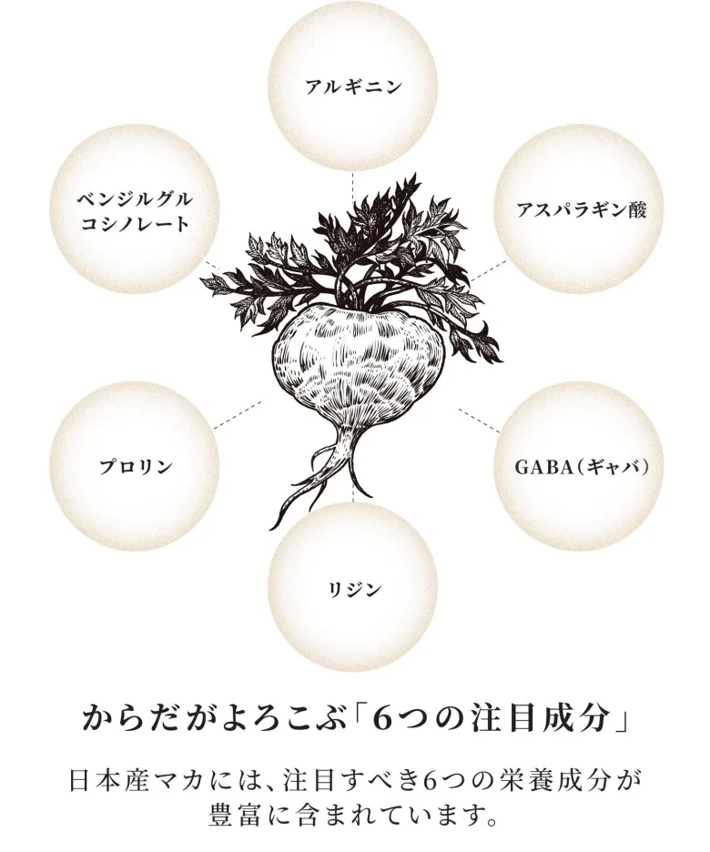 栽培期間中、化学合成農薬不使用で、日本特有の資材で成分を増強した国産マカを使用