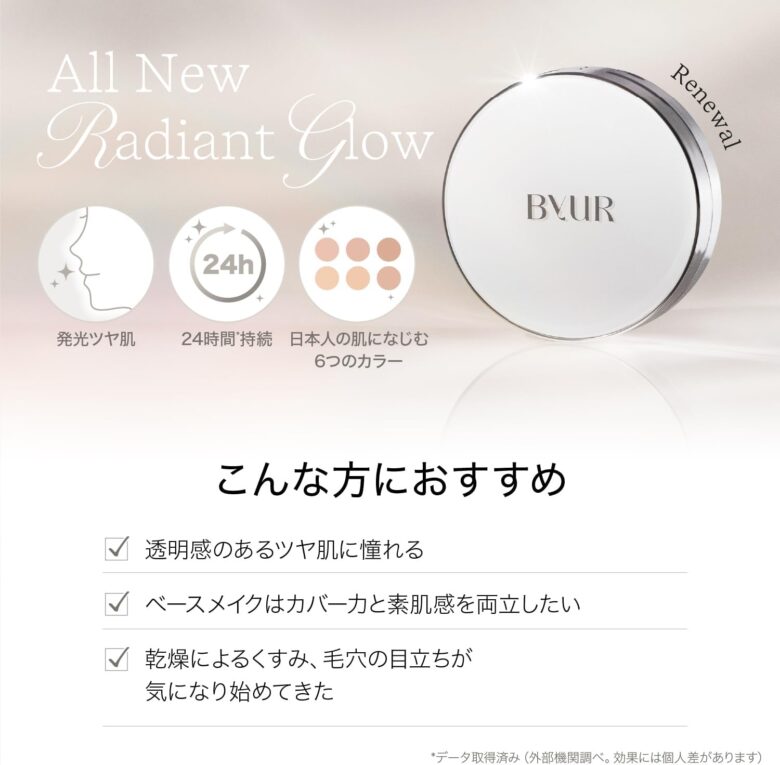 スタイリッシュでスリムなクッションに、光を生み出す5種類の発光レイヤー、さらに、毛穴ケアに着目した5つのアプローチや、独自成分「バイリビタ」などのスキンケア成分を62%以上高配合しています。