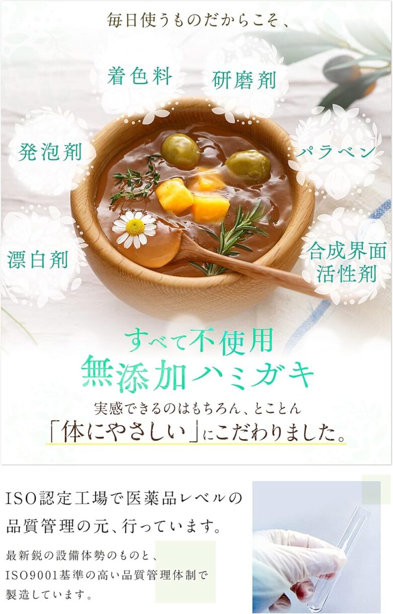はははのはは、製薬会社と共同開発した新しいホワイトニング歯磨きジェルで、6つの無添加✕オーガニック成分を配合しています。