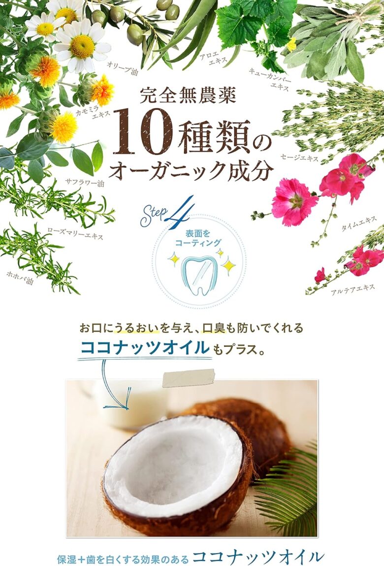 完全無農薬10種のオーガニック成分(オリーブオイル、ホホバオイル、アロエエキスなど)やココナッツオイルをプラス。
