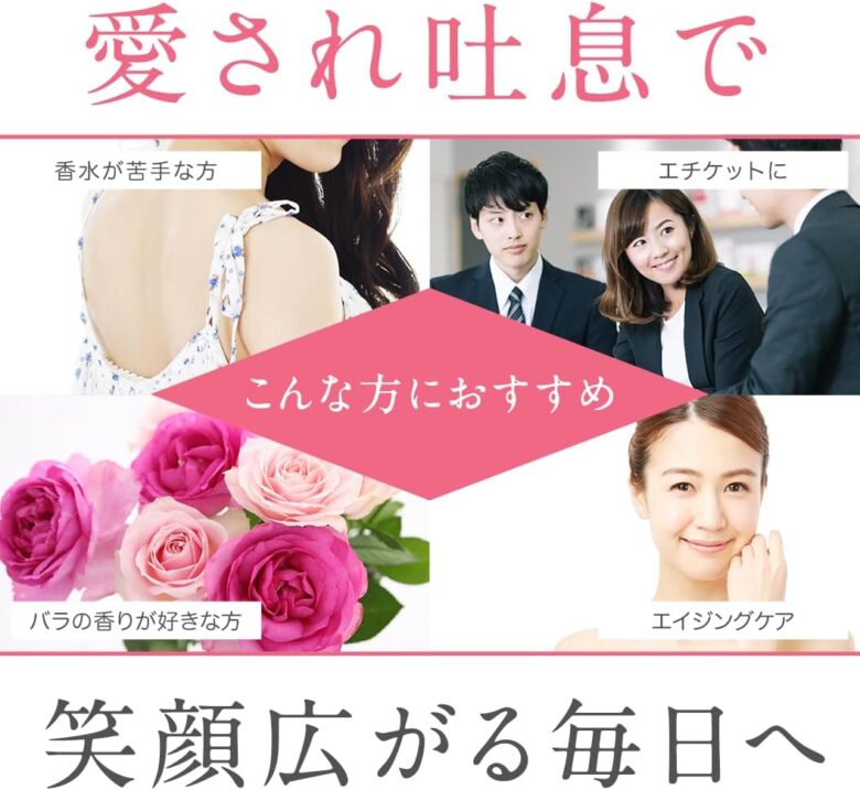手軽に飲用できて、吐息がバラの香りに変わる女子力アップアイテムとして、SNSなどの口コミでも大変な人気があります。