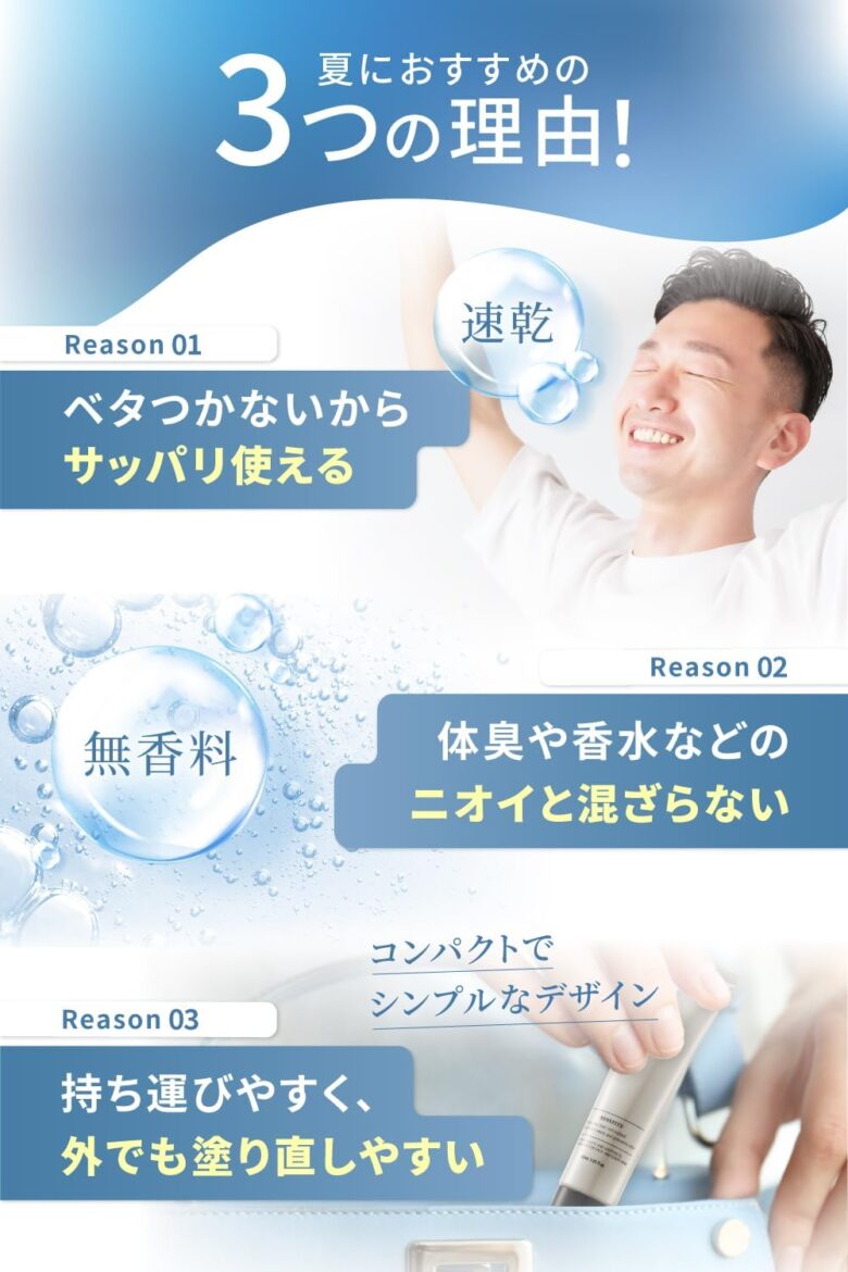 使い心地もサラッとしていて、速乾性も高く、透明なジェルで、肌になじんでべたつきにくく服への色移りの心配もありません。