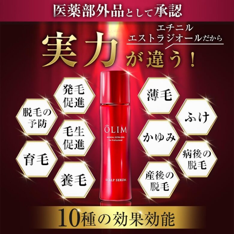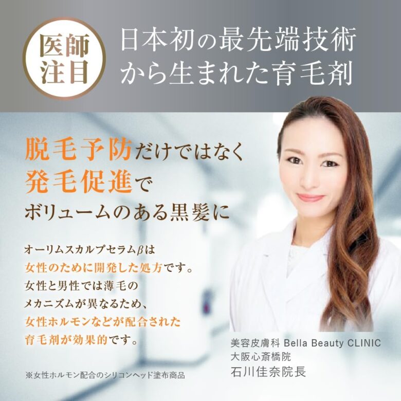 そこで女性ホルモンを配合し、発毛を促進する日本初の最先端育毛剤「オーリムスカルプセラムβ(ベータ)」をおすすめします。