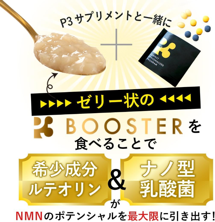 「P3ブースターゼリー」は、P3の吸収率をさらにアップさせ、NMNやコエンザイムQ10など53種類の健康・美容成分の効果をより高めてくれる優れたサプリメントに仕上がっています。